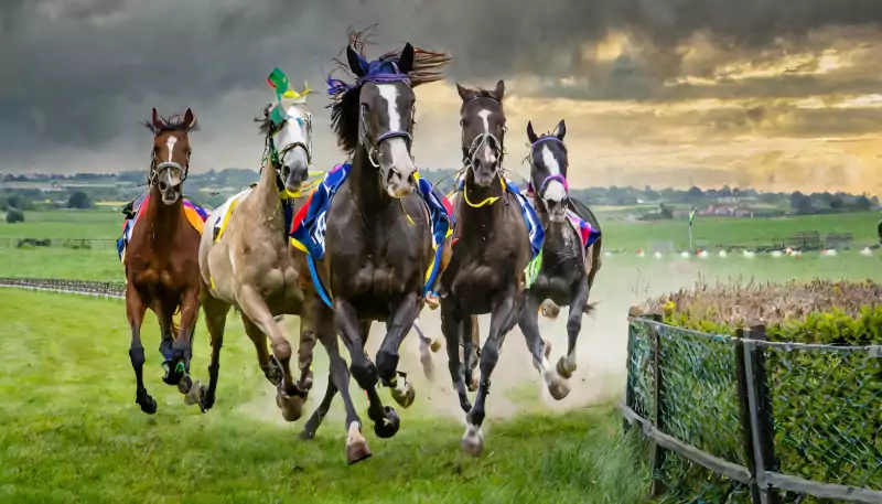 Tekoälyn kanssa saa toisinaan juuri sen mitä pyytää. Pyysin hevosia laukkaradalla. Tämän kuvan jälkeen opin tarkentamaan, että tarkoitin hevosta ratsastajan kanssa.