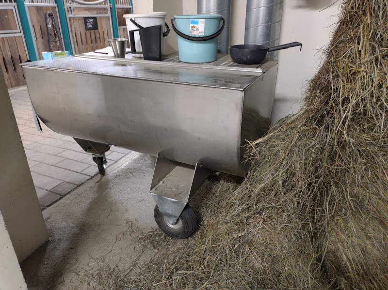 Siirrä pyörille kaikki minkä voit. Kantaminen on keholle rankempaa kuin työntäminen. Kuvassa ruokintakärry.