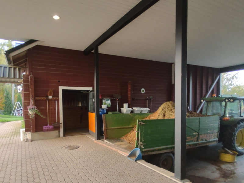 Rinteeseen rakennetussa tallissa on mietitty askelia. Tallikäytävältä on vain muutama askel lantalaan. Talikot ja harjat ovat telineessä lähellä karsinoita. Lantakärry on helppo viedä. Lantalan yläpuolella on katos ja valo.