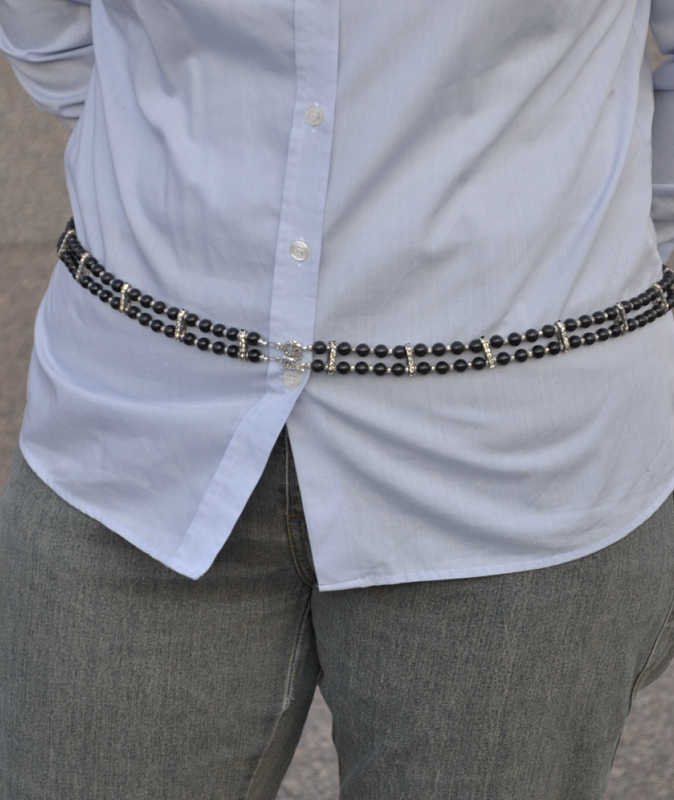 Vyö on tehty koruvaijeriin käytännössä samalla tavalla kuin kaulakorut yleensä. Tein vyöstä melko löysän, jolloin se asettuu vyötärön ja lantion välimaastoon. Vyötä voi pitää rennosti farkkujen ja kauluspaidan kanssa tai sitä voi käyttää leningin kanssa. Sen voi nostaa myös kaulalle kaksiriviseksi kaulakoruksi.