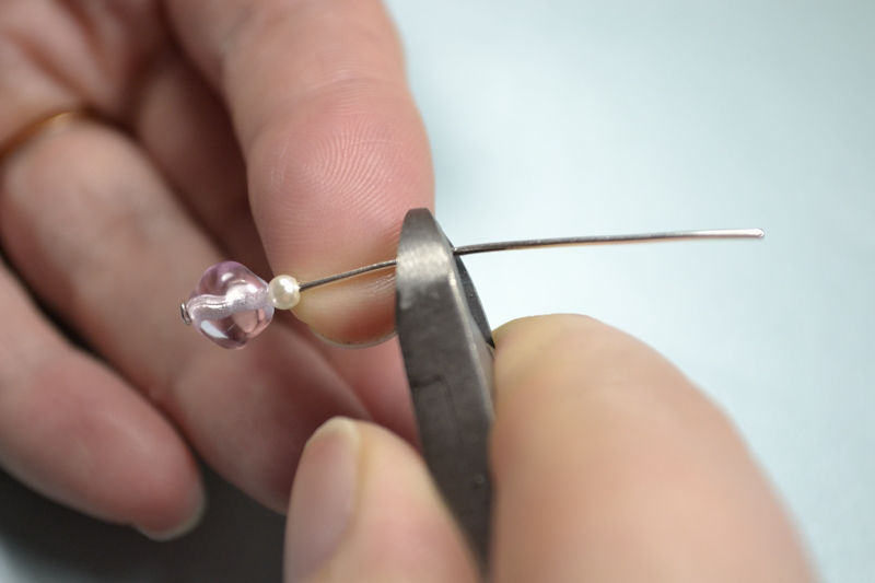 Pujota piikkiin kaksi helmeä, ja jätä piikkiä näkyviin noin sormenleveä pätkä. Leikkaa loppu pois. Leikatessa suosittelen pitämään sormea irtoavaa päätä vasten, jotta se ei singahda hukkaan ja aiheuta vahinkoa. Koruun käytettävät helmet voivat olla mitä tahansa väriä ja mallia, mitä kotoa löytyy tai kesämekkoon sointuu, mutta niiden on suositeltavaa olla pyöristettyä mallia (riisinjyvä, pyöreä, fasettihelmi). Biconit voivat olla turhan teräviä.