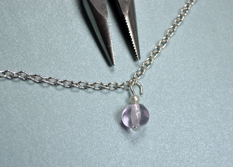 Katkaise sivuleikkureilla ketjusta noin nilkanympäryksen mittainen pala. Huolehdi siitä, että lenkinpalaset eivät singahda minnekään, muuten ne löytyvät takuulla jonkun jalkapohjasta. Pujota juuri tekemäsi koriste ketjuun ja purista silmukka kiinni. Tällä samalla kaavalla jatkat, kunnes korussa on mielestäsi sopivasti helmiä.