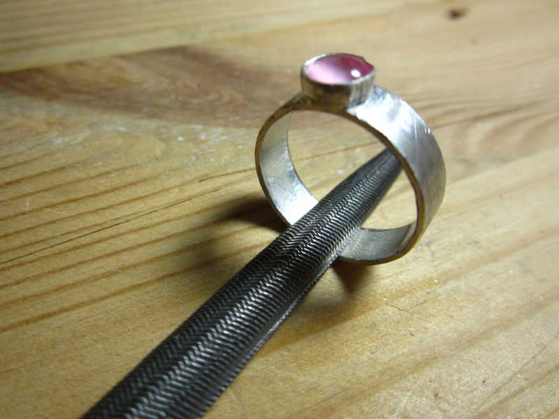 Sen jälkeen siirryin varsinaisen sormusosan kimppuun hioen happokäsittelyn jättämän mattapinnan pois, ensin viiloilla ja sitten hiomapaperilla. Samalla pyöristin reunoja, jotta hopeasormus ei olisi käytössä terävä. Ja kas niin, sormus oli valmis. Ei muuta kuin käteen vaan.