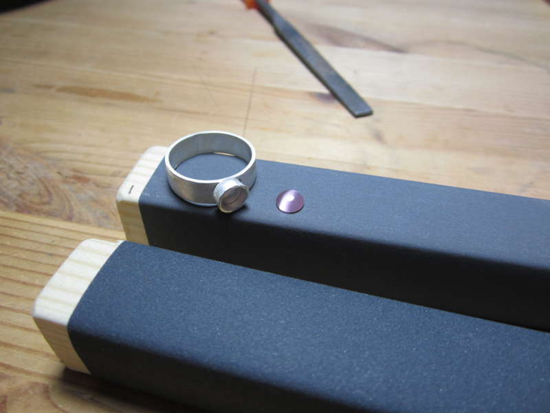 Pesää varten tehtiin aivan samanlainen rinkula kuin itse sormus on, mutta paljon pienempi. Alla näkyvästä kuvasta sitä tuskin erottaa, joten olen piirtänyt nuolen osoittamaan sitä. Se oli sen kokoinen, että 6 mm halkaisijaltaan oleva kivi juuri ja juuri mahtui sisälle. Opettajan mukaan se sai olla aavistuksen väljä, sillä kivi olisi hyvä saada pois pesästä, jos tarve tulisi. Tämä minisormus juotettiin kiinni samalla tavalla kuin itse sormus. Kun rinkula oli sievästi kiinni, sen alle juotettiin kiinni pieni palanen ohutta hopealevyä. Kun pesässä oli seinät ja lattia, sahasin levystä ylimääräiset pois.