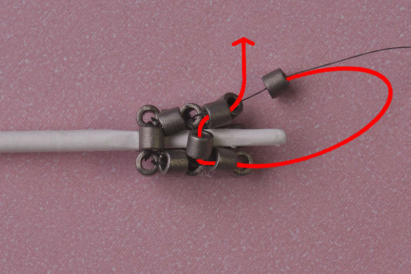 Kun helmet ovat renkaana, aseta ne tikun ympärille. Tikku helpottaa suuntien hahmottamisessa ja tikun ympärille on helpompi punoa. Tämä on kuution ensimmäinen sivu.