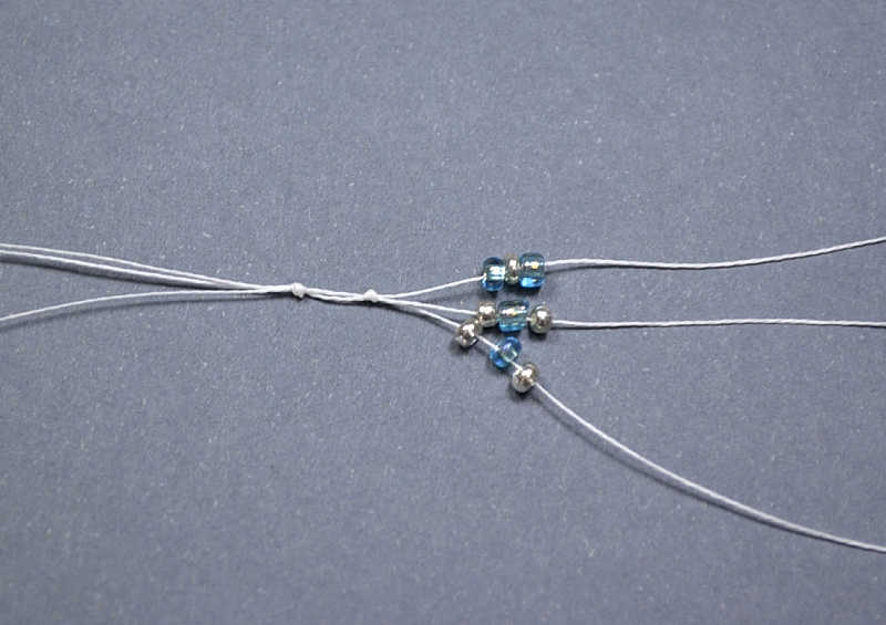 Leikkaa kolme samanmittaista langanpätkää. Jos teet rannekorun, sopiva langan mitta on 60 cm, kaulakorussa noin metri. Ensin tehdään tuplasolmu. Älä tee niin kuin minä, joka teki kaksi erillistä solmua, vaan yritä saada ne samalle kohdalle esimerkiksi neulan avulla. Myöhemmin näytän, miten tuollainen virhe peitetään, jos se sattuu käymään. Kuvasta näkyy, että helmet saavat olla keskenään erikokoisia, eikä se tässä työssä haittaa yhtään. Suurin vaikeus taitaa olla lankojen pitäminen erillään, jotta ne eivät sotkeudu toisiinsa.
