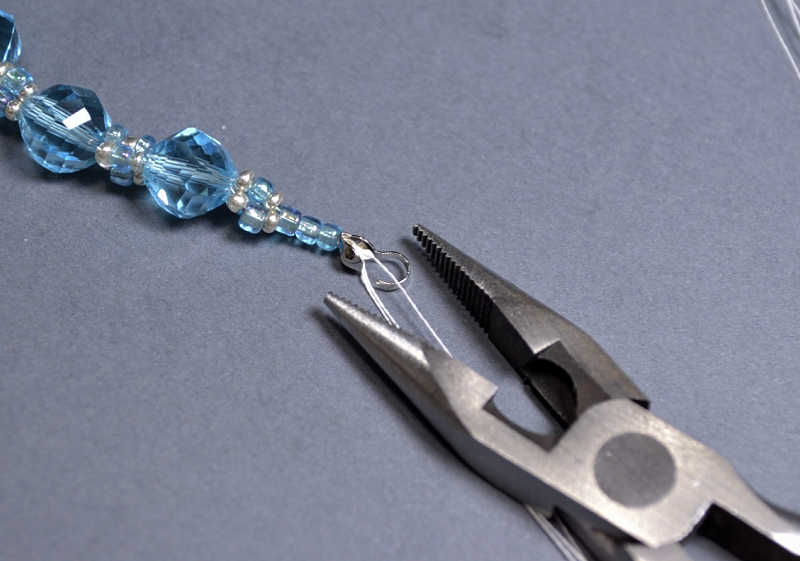 Sen jälkeen liu’utetaan lankoihin solmunsuoja. Yhteen langoista tulee pieni helmi, jonka avulla solmu pysyy pesässä eikä se livahda pois pohjan reiästä. Helmen pitää olla riittävän pieni, että solmunsuojan kannet mahtuvat kiinni. Sen jälkeen vielä pari tiukkaa solmua, halutessasi voit varmistaa solmut tipalla liimaa. Jos teet pitkän, pään yli pujotettavan kaulakorun, erillistä lukkoa ei tarvita, ei myöskään solmunsuojaa vaan voit sitoa vain päät toisiinsa.