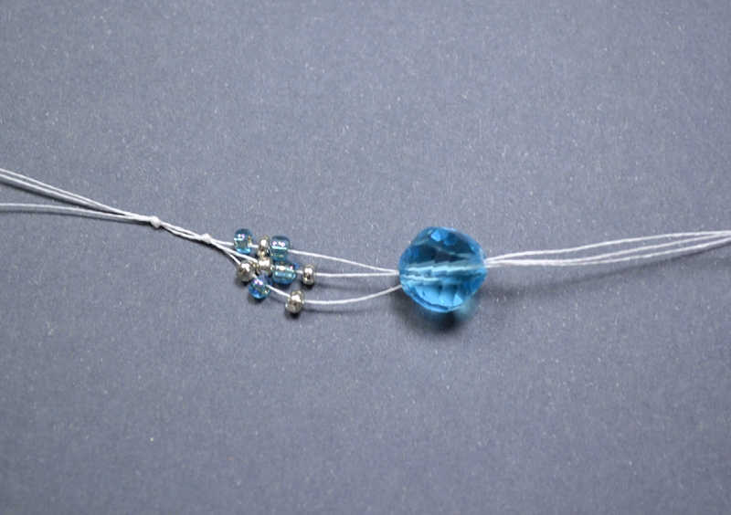 Pienten helmien jälkeen tulee iso helmi. Kaikki langat menevät ison helmen läpi. Periaate on, että suuret helmet ovat yleensä näyttävimmillään rannekorussa, vaatimattomammista helmistä tulee tasapaksumpi ja harmonisempi koru, joka näyttää paremmalta kaulakoruna.